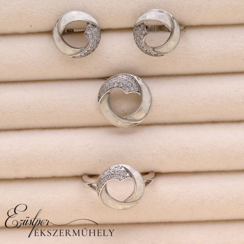 Ezüst, kagylós és cirkónia köves ékszer szett, mely tartalmaz egy pár francia kapcsos fülbevalót, egy medált és egy gyűrűt.