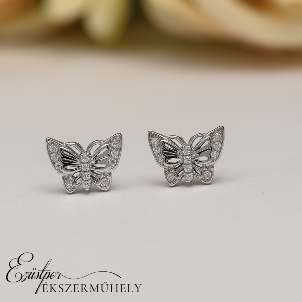 Ezüst, pillangó formájú, cirkónia köves, bedugós fülbevaló.
