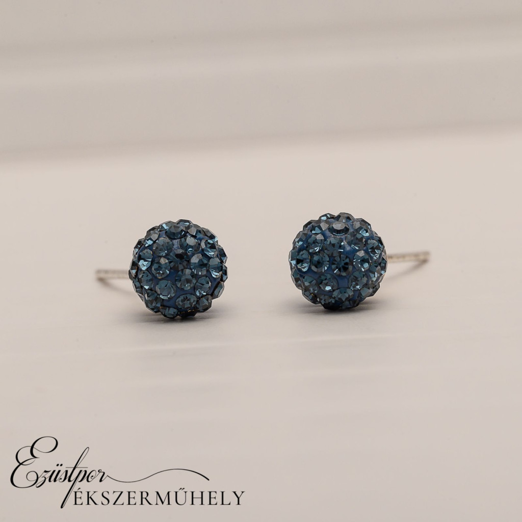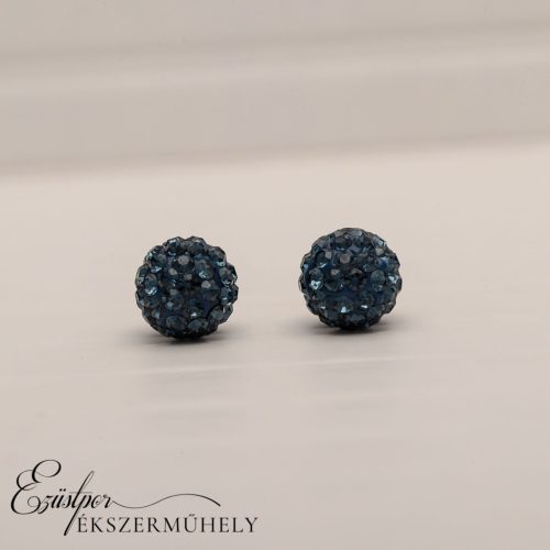 Sötétkék swarovski köves, gömb formájú ezüst fülbevaló, bedugós kivitelben.